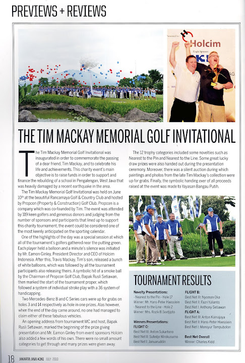 Turnamen yang bertajuk lengkap Tim Mackay Memorial Golf Invitational ini telah diselenggarakan pada tanggal 10 Juni 2010, di Rancamaya Golf Course, dan diikuti oleh 130 peserta dan didukung oleh sejumlah perusahaan besar, seperti PT. Holcim Indonesia Tbk, PT. Skefindo Primatama, PT. Adaro Indonesia, PT Syncrum Logistics, Bank Niaga, Bank BCA, dan beberapa perusahaan industri jasa konstruksi yang dimiliki oleh para anggota PROPCON Golf Club. Selain kontribusi yang didapat dari hasil sponsor, dilakukan juga lelang 2 (dua) buah lukisan karya Ginna Rennie, pelukis wanita Australia, serta 40 buah foto hasil karya Tim Mackay.