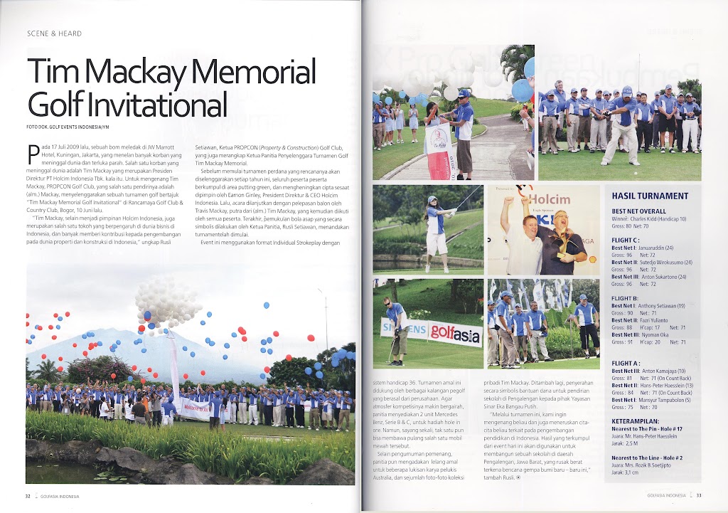 “Dana tersebut terhimpun sebagai hasil penyelenggaraan Turnamen Golf Tim Mackay Memorial untuk mengenang Tim Mackay, mantan Presiden Direktur PT. Holcim Indonesia Tbk (Holcim Indonesia), yang menjadi korban bom di J.W. Marriott pada 17 Juli 2009,” ungkap Rusli Setiawan, Chairman dari PROPCON Golf Club. “Tim Mackay, selain menjadi pimpinan Holcim Indonesia, juga merupakan salah satu tokoh yang berpengaruh di dunia bisnis di Indonesia, dan banyak memberi kontribusi kepada pengembangan pada dunia property dan konstruksi di Indonesia